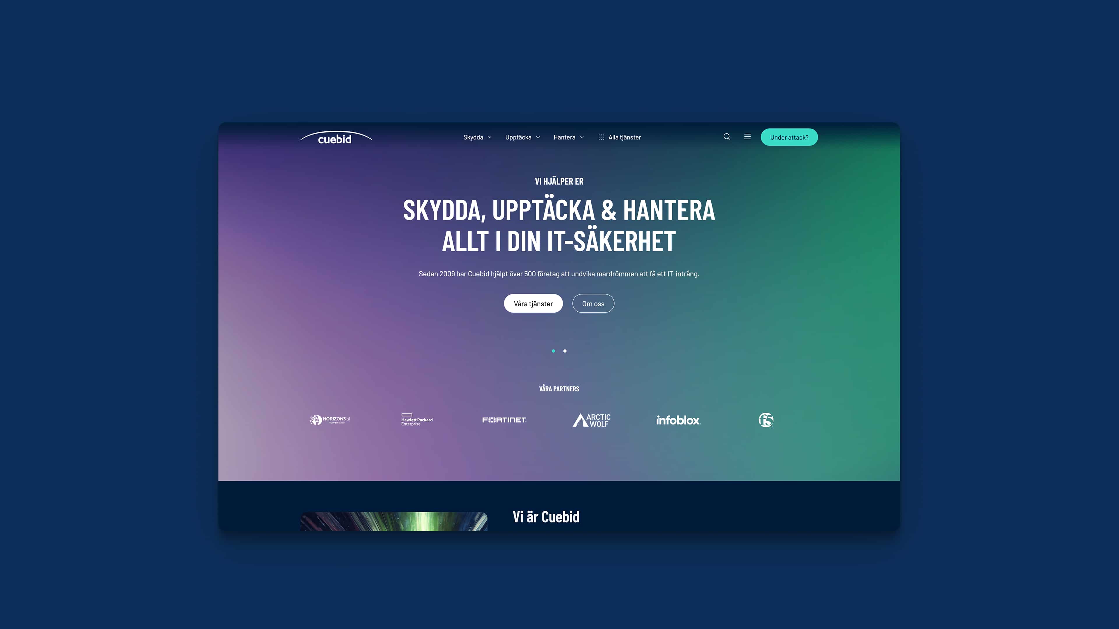 ”Skydda, upptäcka och hantera” är kärnan i Cuebids erbjudande. Dessa tre ord blev därför stommen i sajtens navigering – en lösning som skapar tydlighet, guidar användaren rätt och binder ihop varumärket och tjänsteutbudet.