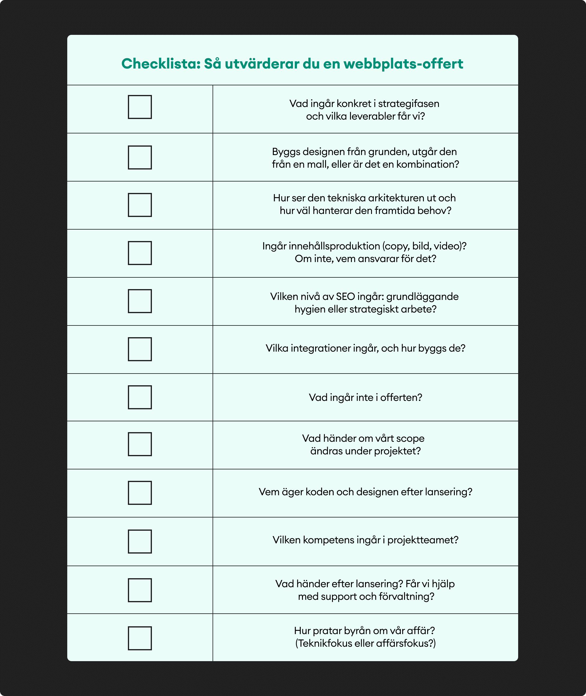 • "Vad händer om vi vill byta byrå efter lansering – äger vi koden och designen?" (Obs! Om svaret är nej på den här frågan borde ni ifrågasätta det).